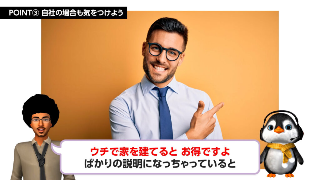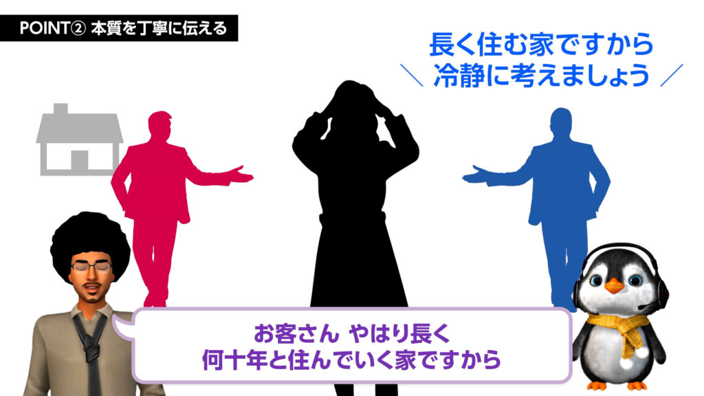 • 目先の利益に囚われているお客様に、競合を批判せずに本質的な価値(家の性能や保証)に気づきを促す視点が得られます。