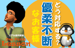 案件の前半では、初回接客でありがちな、お客様の「けん制、予防線」的なことばを受けた場合の対処方法について取り上げます。