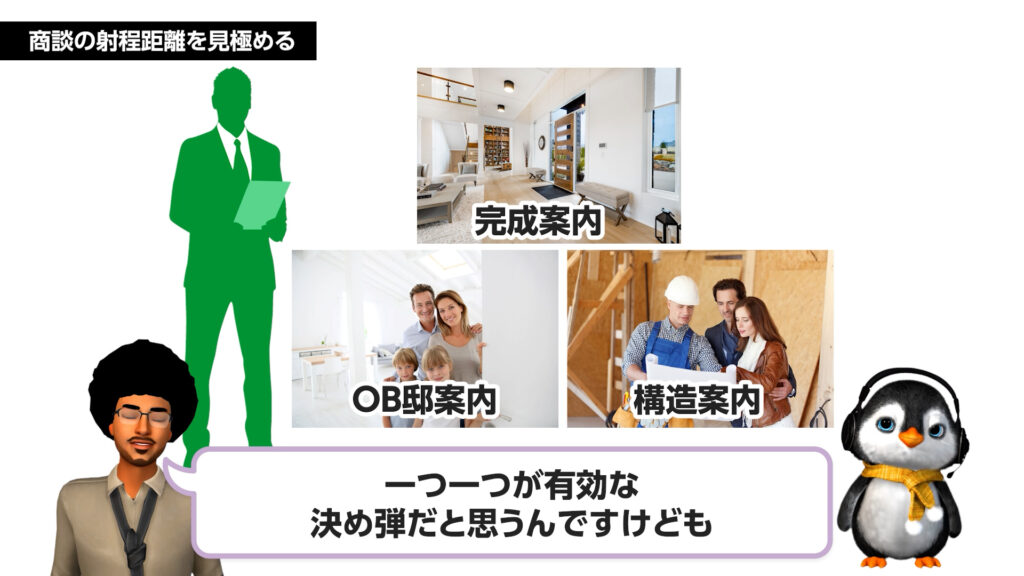 プラン提示だけでなく、OB様案内や構造見学会といった自社の強みを伝えるアピールポイントにも、それぞれ最適な「射程距離」があります 。お客様の関心度や検討段階が低い状態でアピールしても「ピンと来ない」で終わってしまう理由 と、お客様のフェーズに合わせて「決め球」を使い分けることの重要性を学びます。