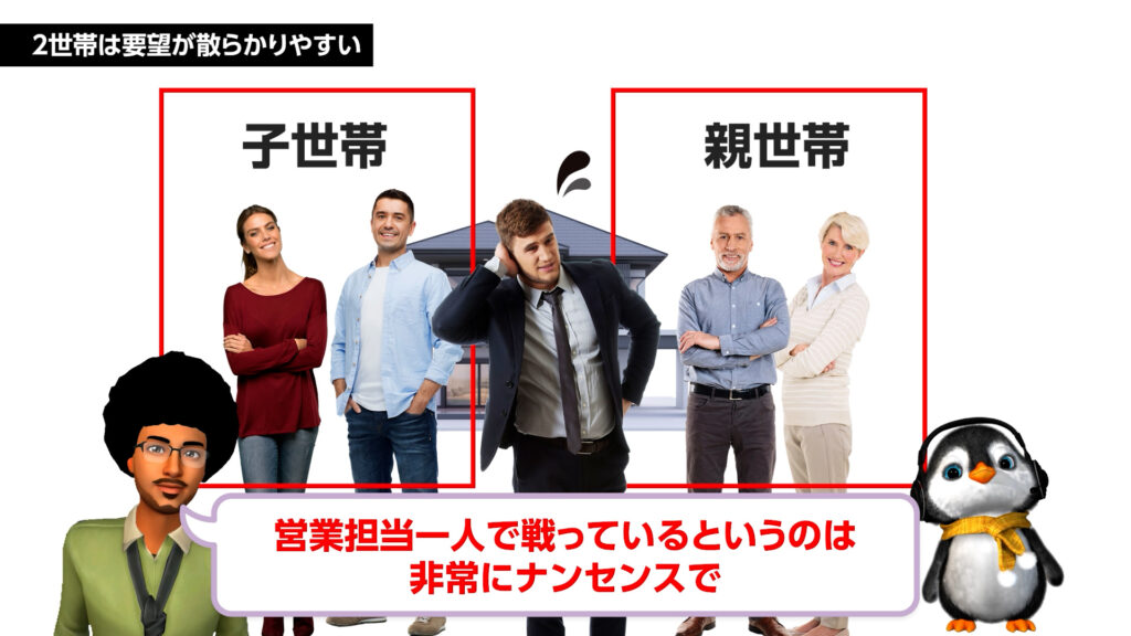 2世帯住宅は、通常の商談の「倍」の難易度があります 。子世帯(構造重視の夫、導線重視の妻)と親世帯(趣味優先の父、予算重視の母)など、4人4様のバラバラな要望がなぜ発生するのか 。営業担当が一人では、この複雑な要望をまとめきれない理由を学びます 。