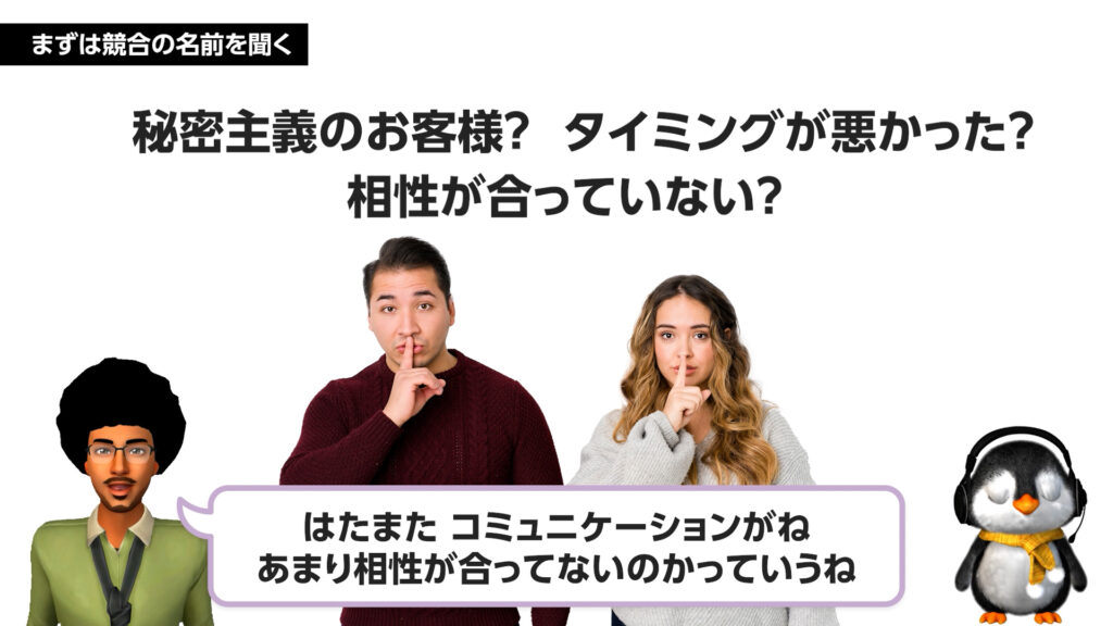 - 競合の「客観的なスペック」と、お客様の「主観的な評価」の両方を聞き出し、多角的に比較する視点が得られます 。