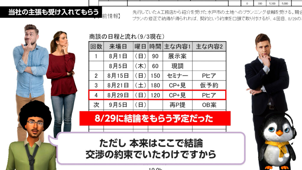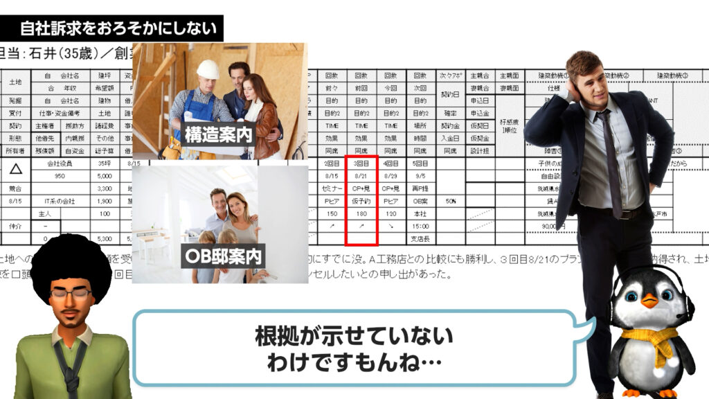 お客様の不安(今回の場合は土地への懸念)に寄り添うことは重要ですが、それだけで終わってはいけません。お客様の要望を受け入れると同時に、こちらの立場(建物契約の確約など)も主張すべき理由とは。一方的な譲歩で商談を白紙に戻さないための、交渉のバランス感覚を学びます 。