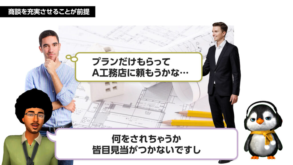 プランの良し悪しだけで勝負が決まるわけではありません。会社の信頼性、担当者の熱意、施工品質への安心感など、商談プロセス全体を通じて築かれる「信頼関係」があってこそ、プランの価値が最大化されます。特に競合がローコストメーカーの場合、自社の設計意図や品質を正しく伝えるための「商談の厚み」がなぜ不可欠なのかを再確認します。