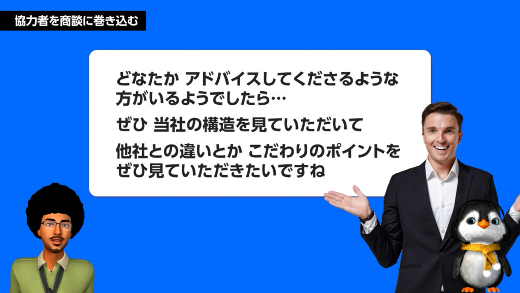「パッシブハウス」など、施主属性にそぐわない専門用語が出てきた時などは、詳しいアドバイザーの存在を前提としたアプローチに切り替える必要があります。隠れたキーマンを早期に表舞台に引き出し、味方につけるためのアプローチ方法を考察します。