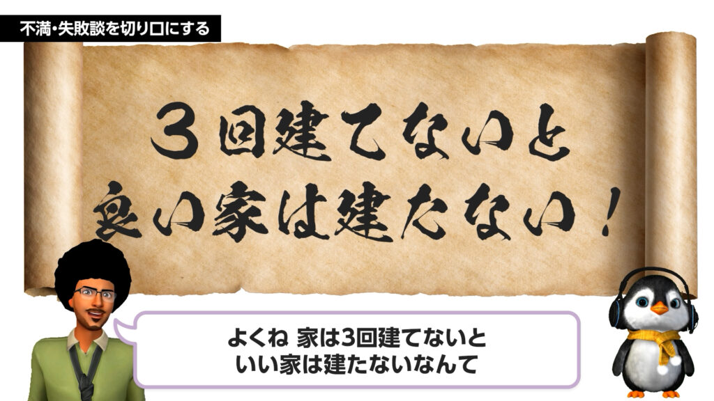 「大手で建てて良かった」と言う親御さんでも、10年住めば何かしらの「不満」や「後悔」があるはずです。その失敗談を突破口に、「今回の家づくりではそれを解消します」と提案しましょう。大手にはない自社の柔軟性や対応力をアピールする高度なテクニックを学びます。