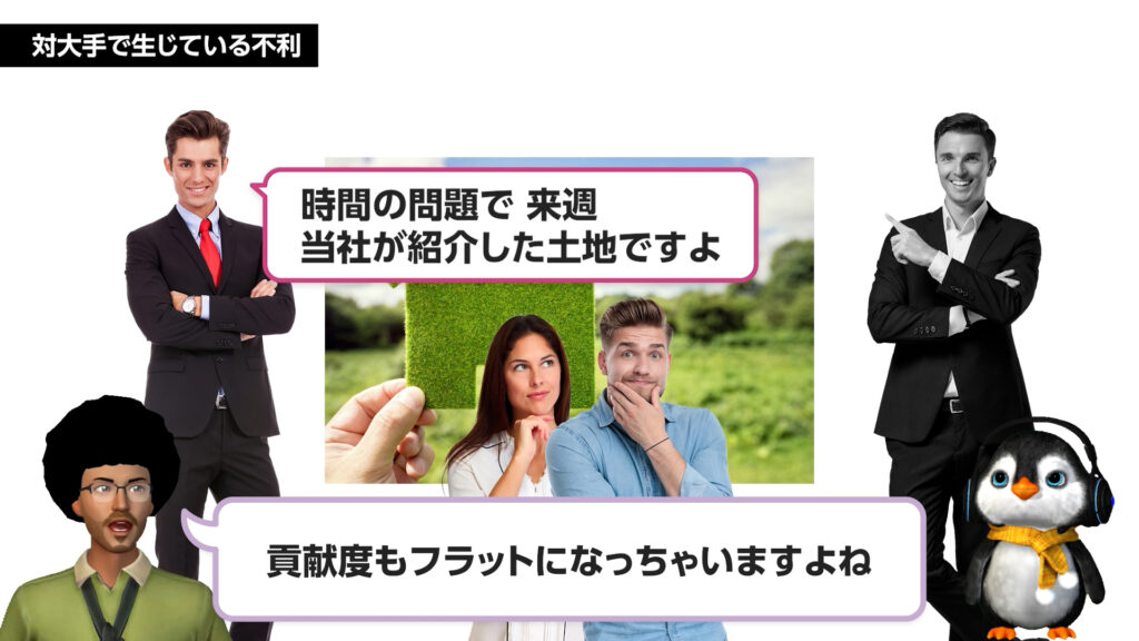 • 土地紹介等で貢献しても、大手メーカー相手に失注してしまうメカニズムを理解できます。