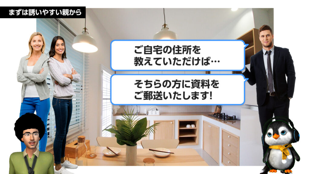 親を「監視役」から「応援団」に変えるために、営業担当者が踏むべき配慮と手順とは?親にとって、20代の子供が数千万円の契約をすることは非常に心配な出来事です。若夫婦とだけでトントン拍子に進めると、親の目には「世間知らずの子供が、営業マンに言いくるめられている」とも映りかねません。
