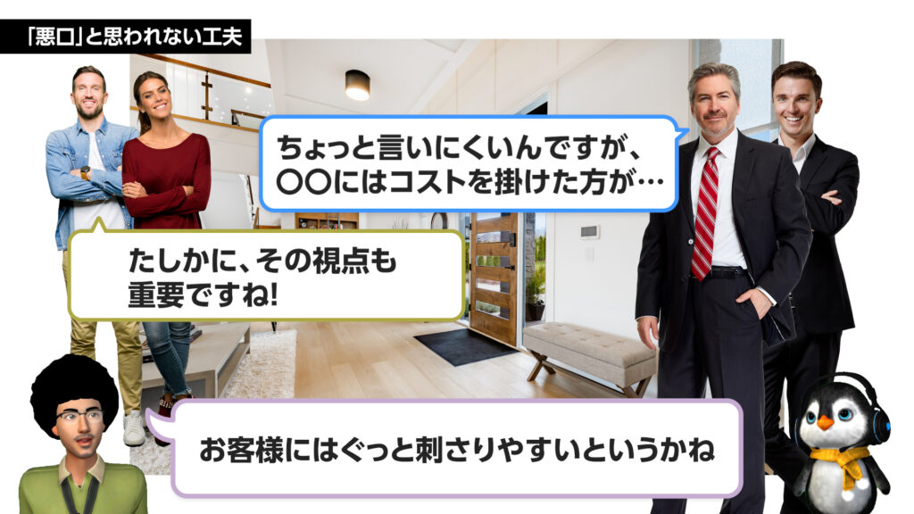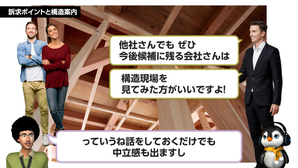同じ総合展示場に新しく入った、建売メインのローコスト系工務店も見学しており、若干坪単価が高い当社としては、「高くても安心感がある」「自由設計のメリット」を打ち出して進めたいところだが…