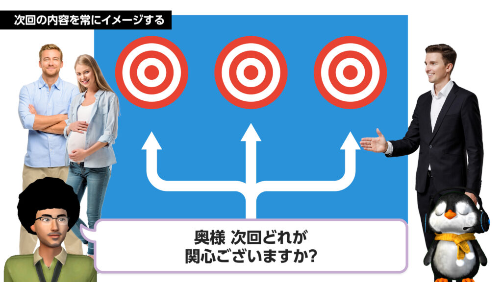 商談は、予期せぬ事情で突然中断することがあります。その際、次回の実施内容が決まっていないと、そのままフェードアウトされるリスクが高まります。どんなタイミングで商談が終わっても、魅力的な次回アポイントを提示できるよう、常に複数の「次回提案カード」を用意しておきましょう。